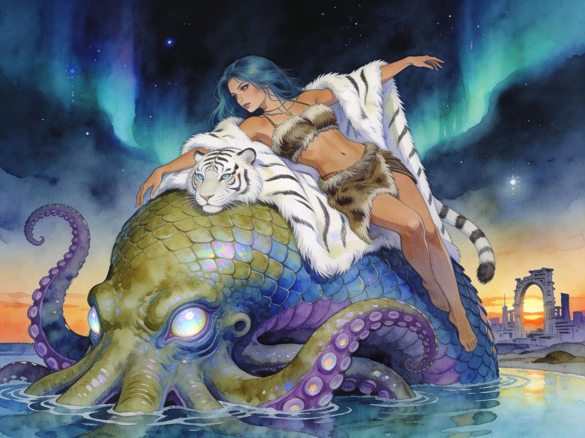 A Lous Royo style watercolour of a kraken (olive/indigo/mauve scaly hide; opalescent eyes) lounging in a tide-pool; a woman (indigo hair; tan complexion; mammoth fur bandeau and skirt; white tiger-fur cloak) stretches out on top of the kraken. Night time, sunset background; indigo/teal aurora; ruined ...