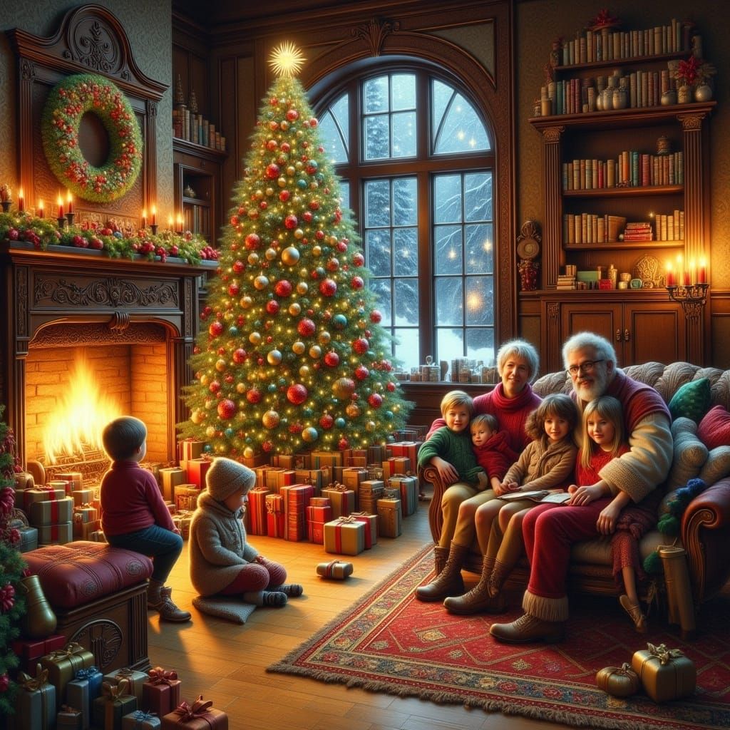This image shows a large family gathered by a fireplace next to a beautifully decorated Christmas tree. The scene is rendered in a storybook graphic style, evoking a warm, festive atmosphere.