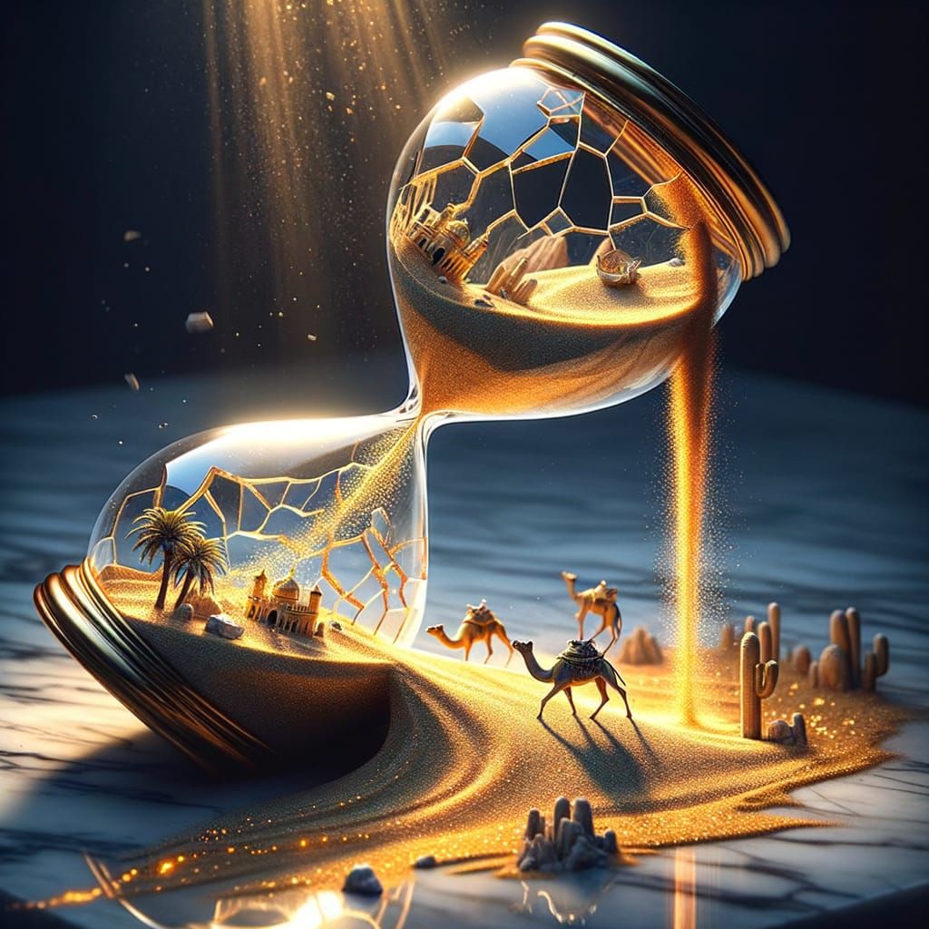 This image captures the poignant beauty of a broken hourglass, with golden sand spilling out to form a miniature desert scene, where camels traverse delicate dunes under the warm glow of sunlight filtering through shattered glass.
