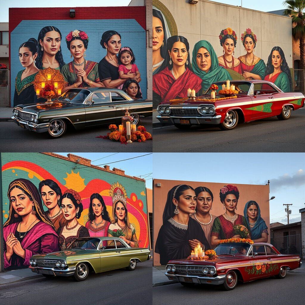 This vibrant mural honors strong Mexican women throughout history, set against a backdrop of urban pride and cultural heritage. Glowing candles, traditional symbols, and a lowrider car create a powerful and emotional atmosphere, celebrating the beauty of Chicano culture.