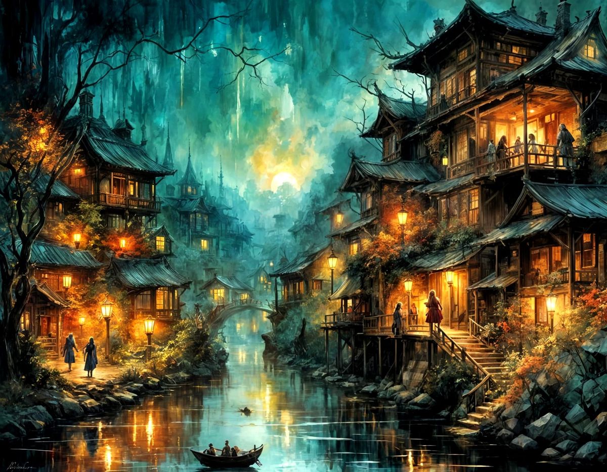 A stunning alcohol ink artwork of a Japanese landscape at sunrise. The image features rivers, valleys, temples, and cherry blossoms in a colorful fantasy style with orange, indigo and cyan accents.