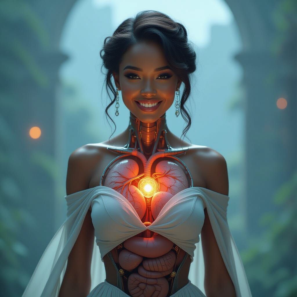 This image shows a beautiful, smiling Black woman with a transparent glass body revealing her organs. She is elegantly dressed and set against a dramatic backdrop with cinematic lighting.