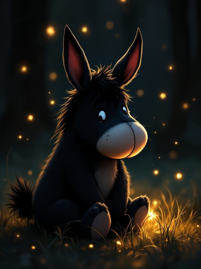 This image is a stylized drawing of Eeyore as a black silhouette with a glowing effect, reminiscent of a playing card illustration in a whimsical, digital art style.