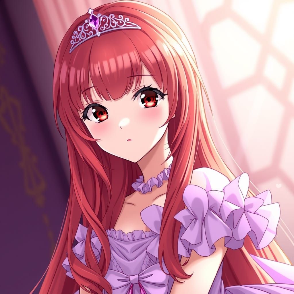 This image shows a red-haired woman with hazel eyes wearing a light purple gown and tiara. The artwork is inspired by anime key visuals and Japanese manga art styles.