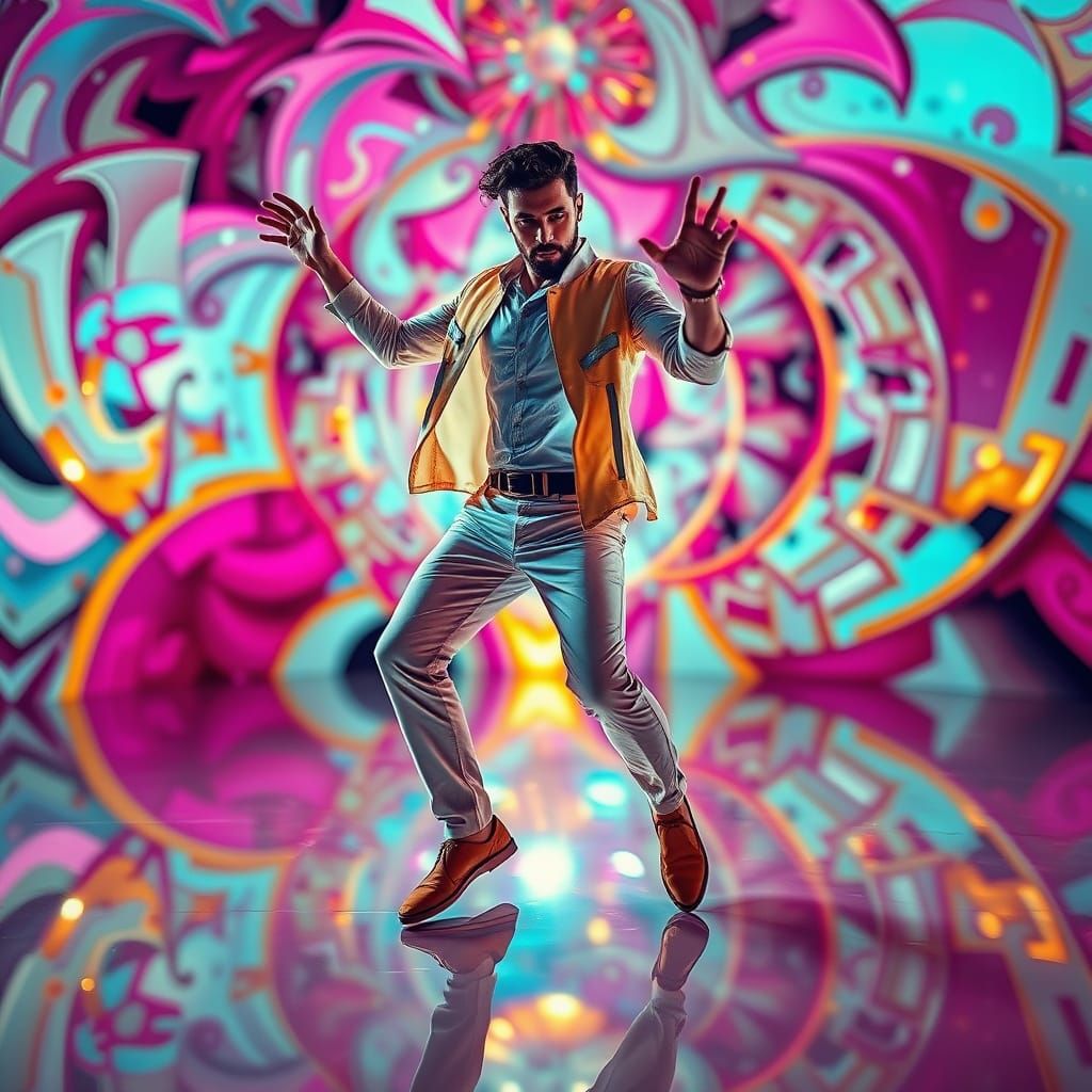 A vibrant portrait of a man dancing on a colorful surface. The image features swirling shapes and patterns in magenta, cyan, and gold, with shimmering, prismatic effects and a high-contrast aesthetic.