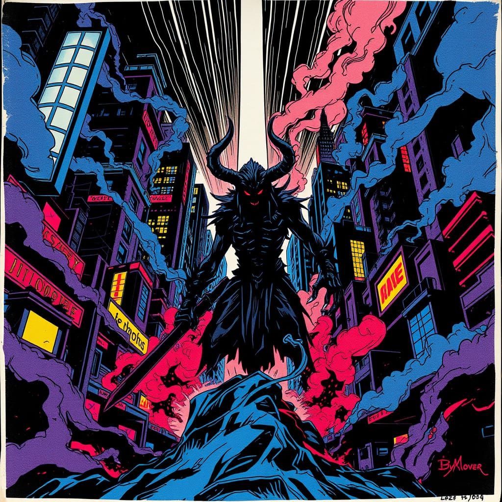 A menacing demon slayer stands in a neon-lit, chaotic cityscape. This dynamic art features sharp lines and vibrant colors, evoking a graphic novel aesthetic with dramatic backlighting.