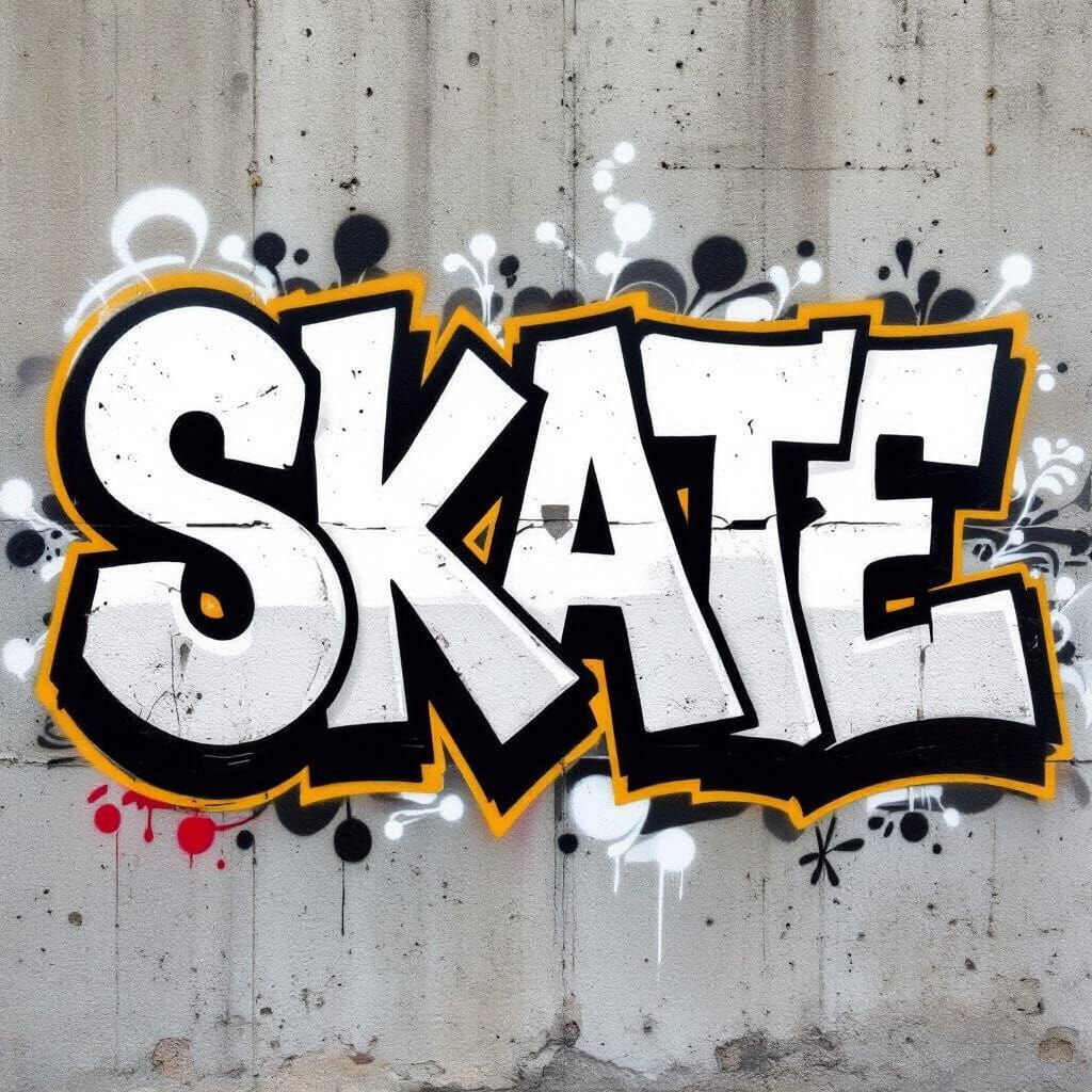 This image showcases bold graffiti letters spelling 'SKATE' with a striking white outline and 3D enhancements, inspired by vibrant street art styles.