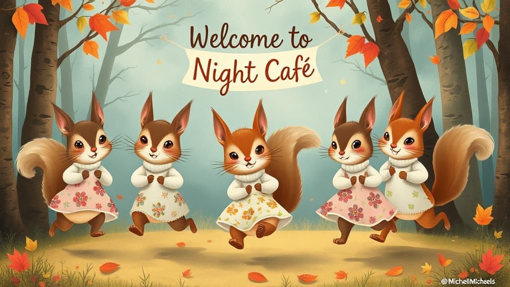 This image depicts whimsical squirrels in floral dresses and sweaters joyfully running through a colorful autumn forest with falling leaves. The scene is magical and ethereal.