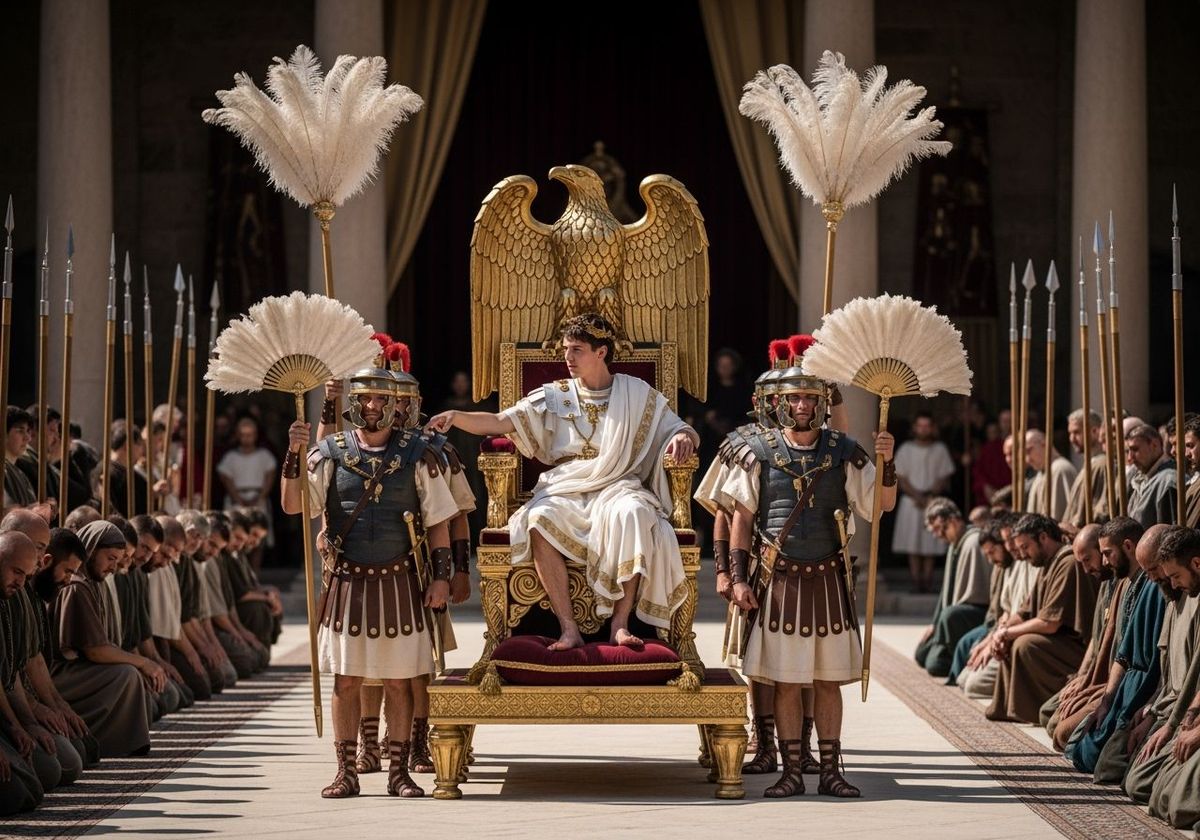 This image depicts a young Roman Emperor being carried on an ornate golden throne by soldiers, with servants and kneeling peasants surrounding him. Captured with sharp focus and natural lighting, the scene embodies opulent regal ceremony.