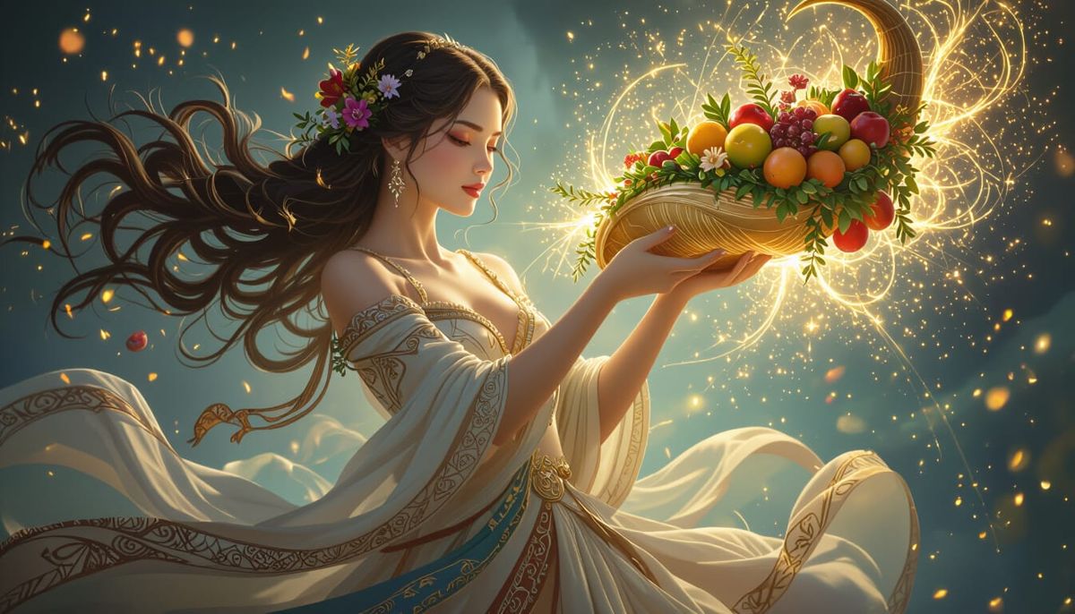 A stunningly realistic image of a woman floating with a cornucopia spilling fruits and flowers. Magical sparkles and light emanate, captured with detailed, cinematic fantasy lighting.
