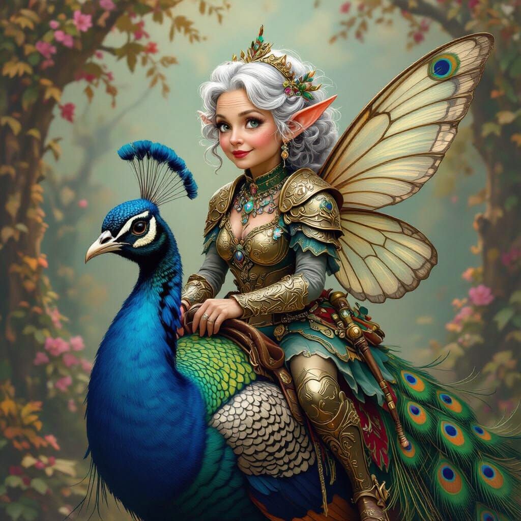 A striking picture of a miniature fairy grandmother with grey hair and delicate wings, clad in ornate armor, riding a colorful peacock. The image features rich details in a matte painting style.