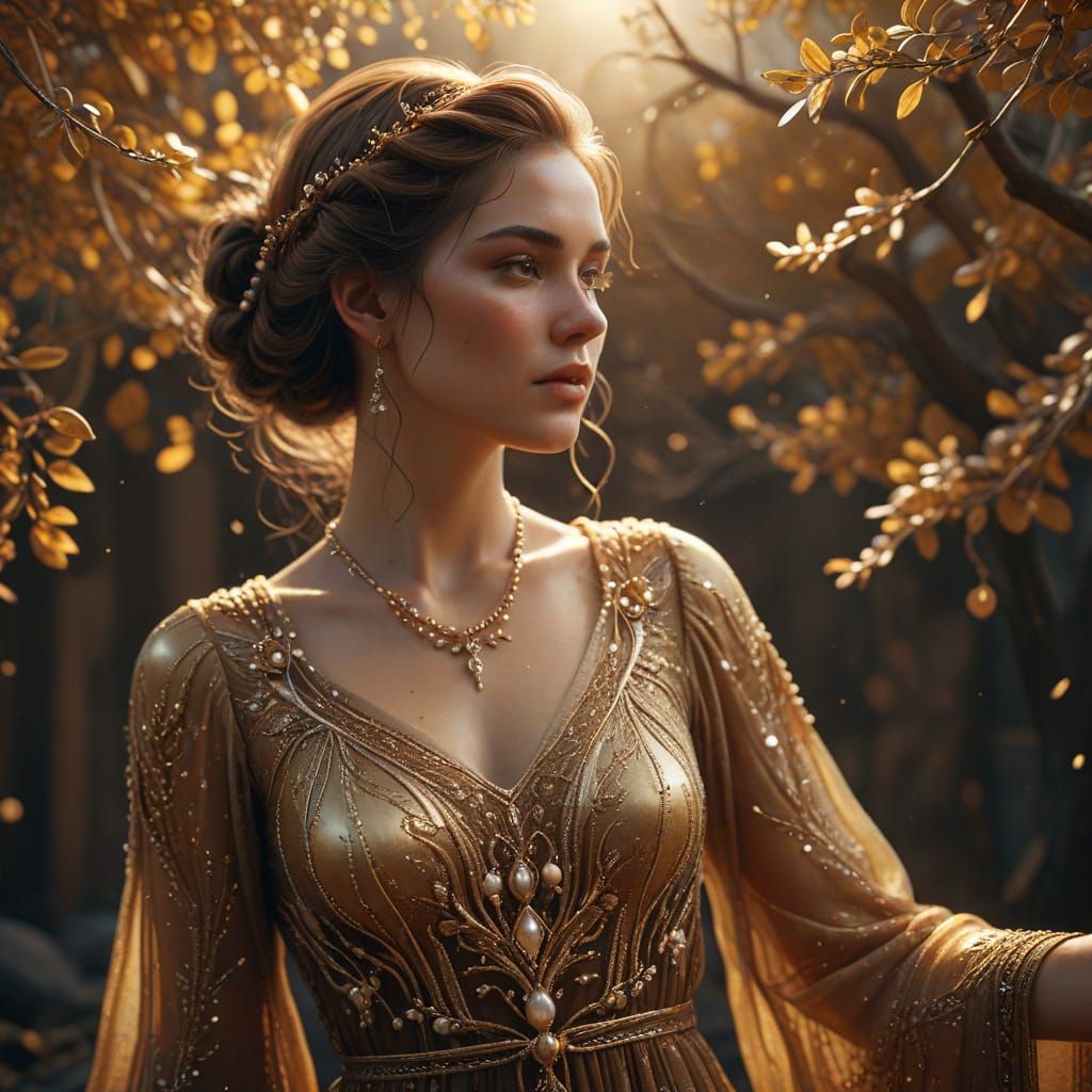 This 3D render depicts a woman in an empire-style dress creating a golden tree. Features Art Nouveau elements, pearls, and ethereal golden dust, lit by dramatic spotlighting.