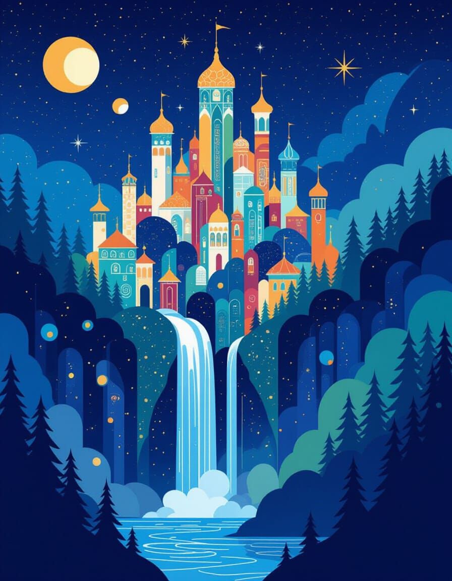 This image shows a vibrant waterfall flowing through a magical forest city under a starry night. The scene blends organic forms and tessellations with stained glass and mosaic elements in a flat, paper craft style.