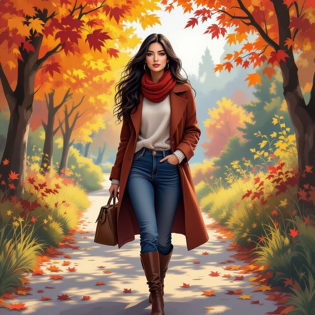 Realistic, watercolor, acrylic (a masterpiece of the highest quality), A beautiful woman with a perfect face, make-up, and long flowing black hair that flutters easily in the breeze as she walks along a path lined with autumn leaves. She is dressed in a cozy fall outfit that is appropriate for the season. ...