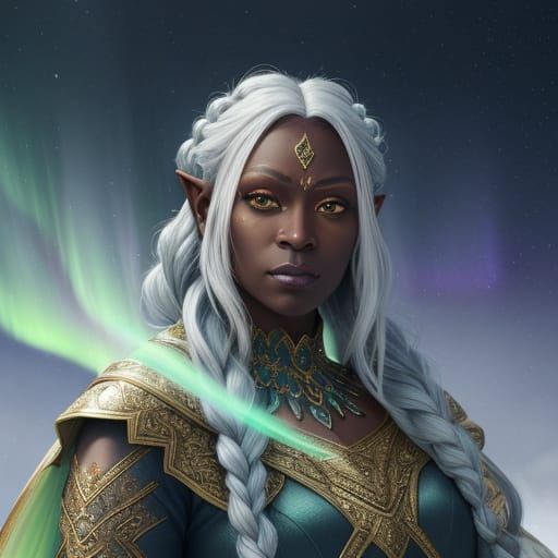 This enchanting portrait showcases a majestic woman with striking features and vibrant attire, set against a captivating winter wonderland backdrop with intricate textures and magical realism.