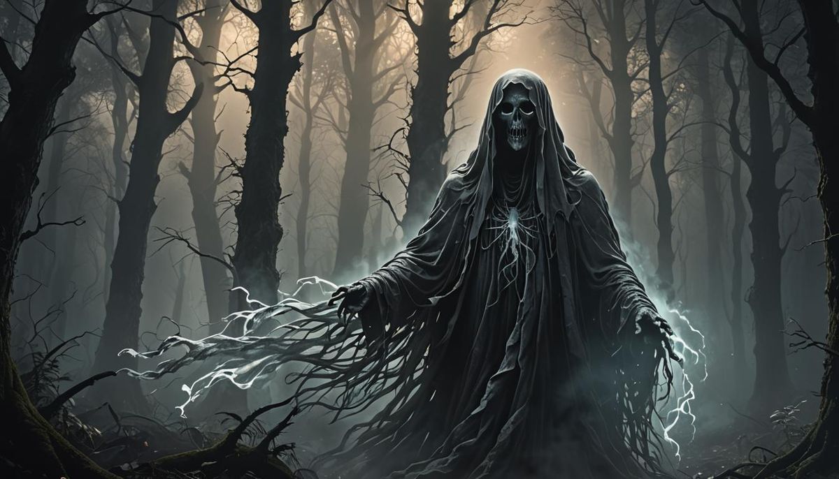 This image shows a spectral figure haunting a dark forest. Ethereal light pierces through the trees, casting dramatic shadows and intense contrast in this grimdark horror concept art.