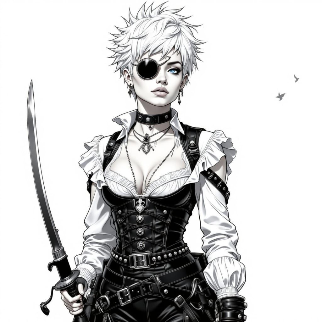 This image displays a fierce pirate woman with a pixie cut, wearing a corset and holding a cutlass. The artwork features bold black outlines, presented in a striking black and white style.