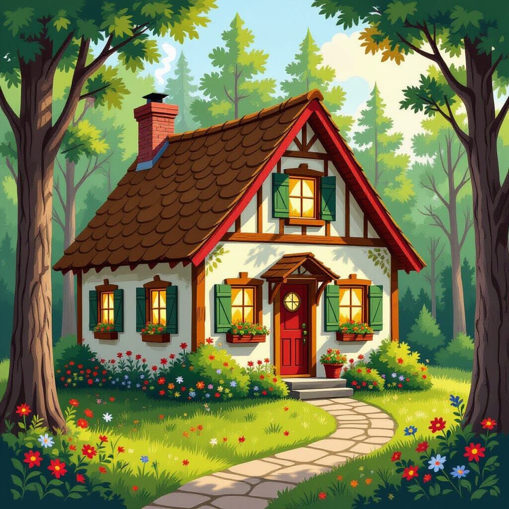 A vibrant folk art image of a cozy cottage nestled in a lush forest. Sunlight warmly illuminates the interior, highlighting the intricate details and bold colors of the scene.