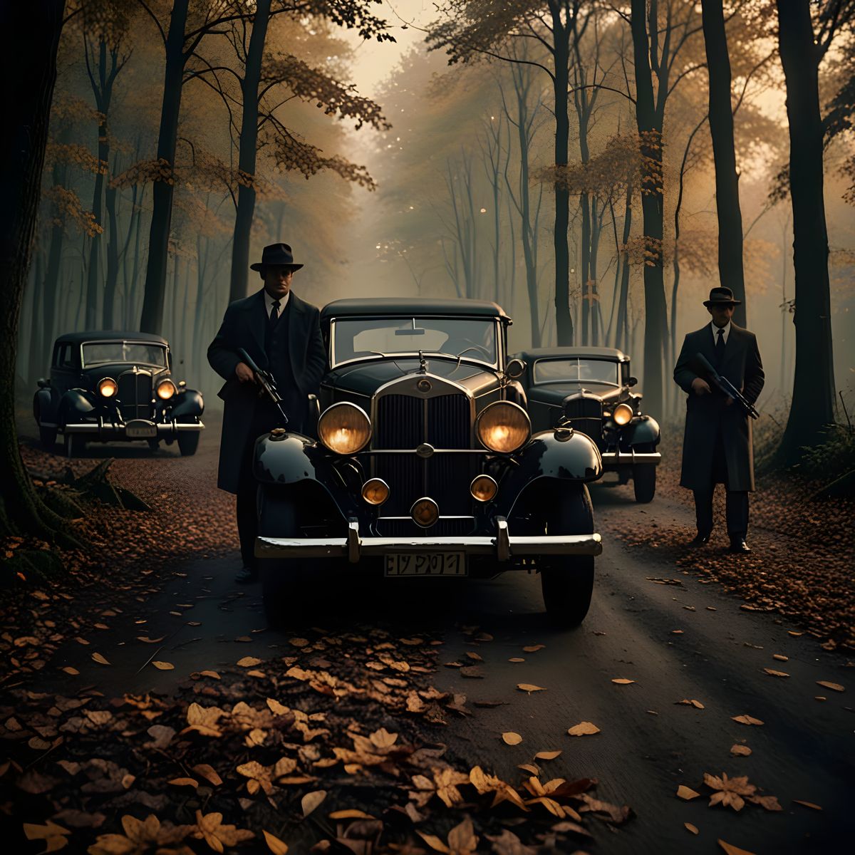 This image depicts a vintage gangster scene with a classic car and Al Capone-era figures wielding machine guns in a misty forest during an autumn evening. The scene evokes a moody, cinematic atmosphere.