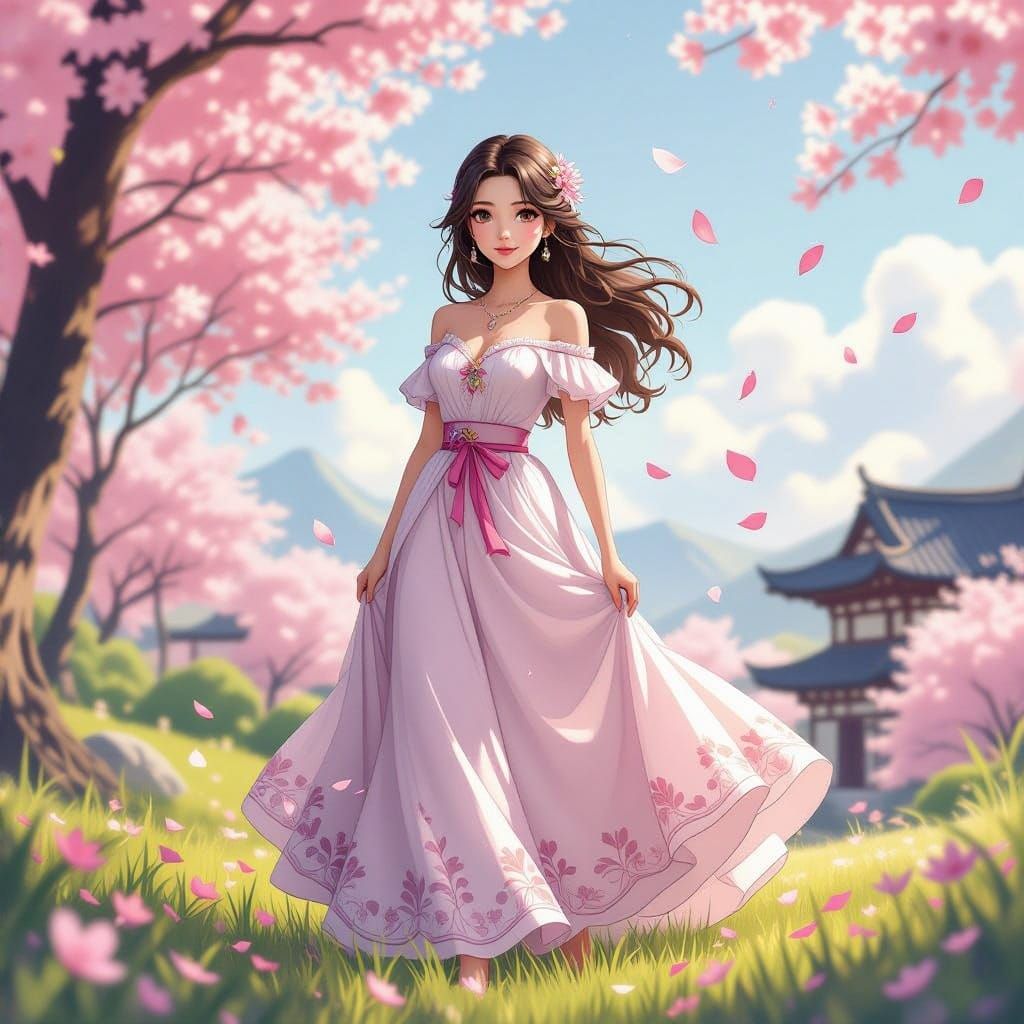 This image shows a young woman in an elegant dress amidst a soft pastel landscape. The scene is bathed in gentle light with floating flower petals, rendered as 3D anime art.