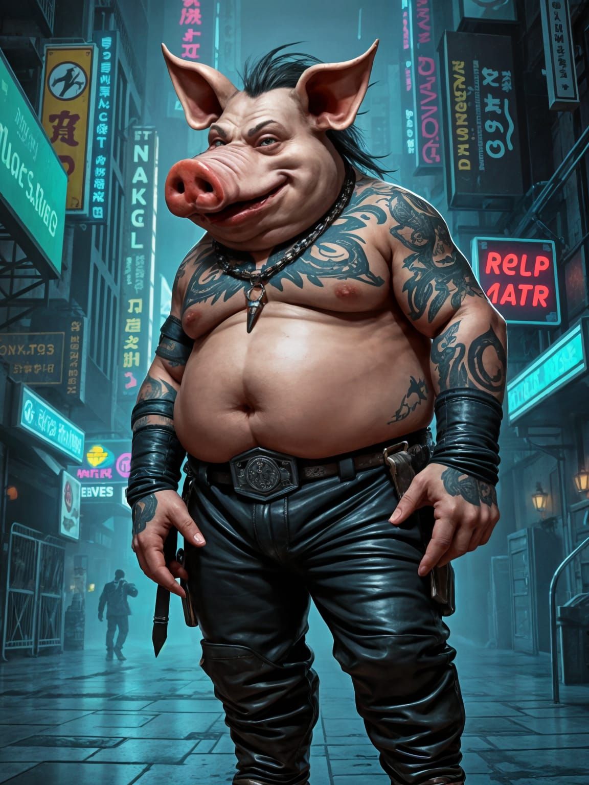 This image shows a heavily tattooed, overweight pig-like barbarian in leather pants. The character is set in a cyberpunk city with neon lights, reminiscent of Blade Runner 2049.