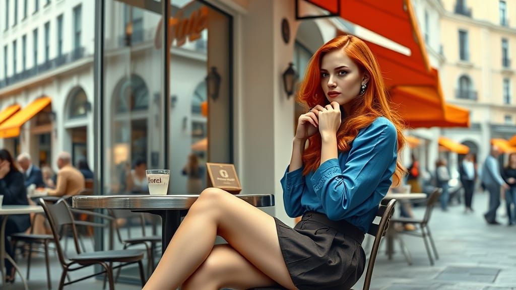 This image shows a stylish woman with red hair sitting at a cafe, enjoying coffee. The scene is rendered in an idealized naturalism style with soft focus and harmonious colors, reminiscent of classic oil paintings.
