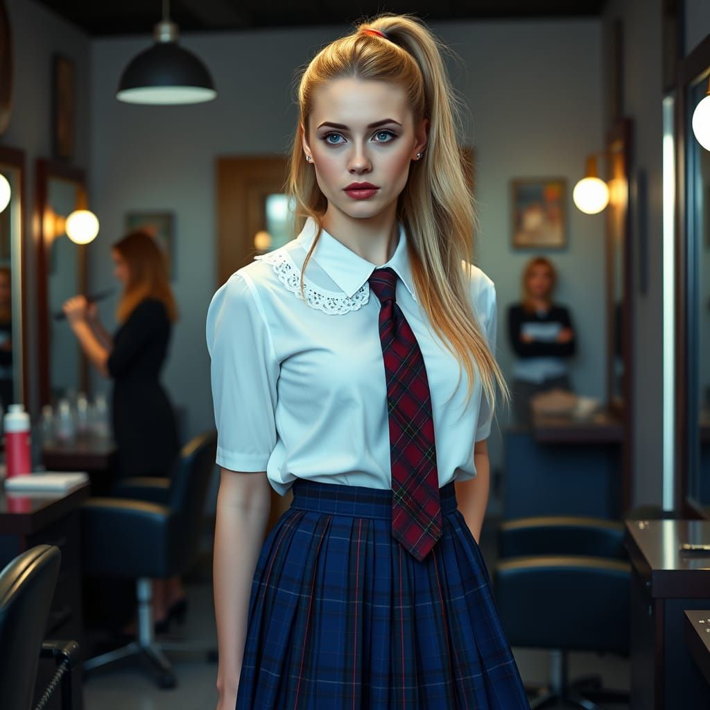 This image shows a dramatic, cinematic scene of a young woman in a modernized school uniform, standing in a hair salon as her hair is shaved off, radiating sadness and regret. Created in a maximalist digital matte painting style with intricate details and atmospheric lighting.