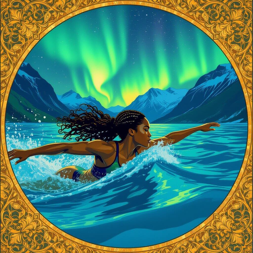 A striking picture of a Black female athlete swimming in a Norwegian fjord under the Northern Lights. The image is rendered in an art nouveau style with a vibrant color palette and ornate golden accents.