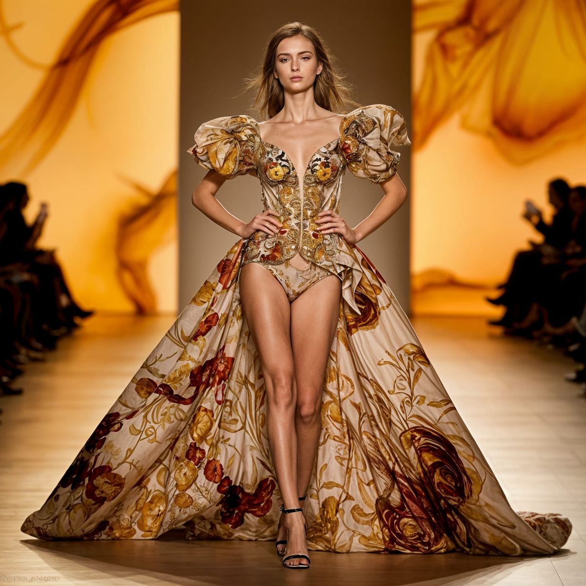 This image shows a confident female model strutting down a French fashion runway, surrounded by a minimalist yet elegant setting, and a soft, blurred audience, all bathed in warm, golden lighting, with intricate, swirling patterns on her dress reminiscent of alcohol ink art.