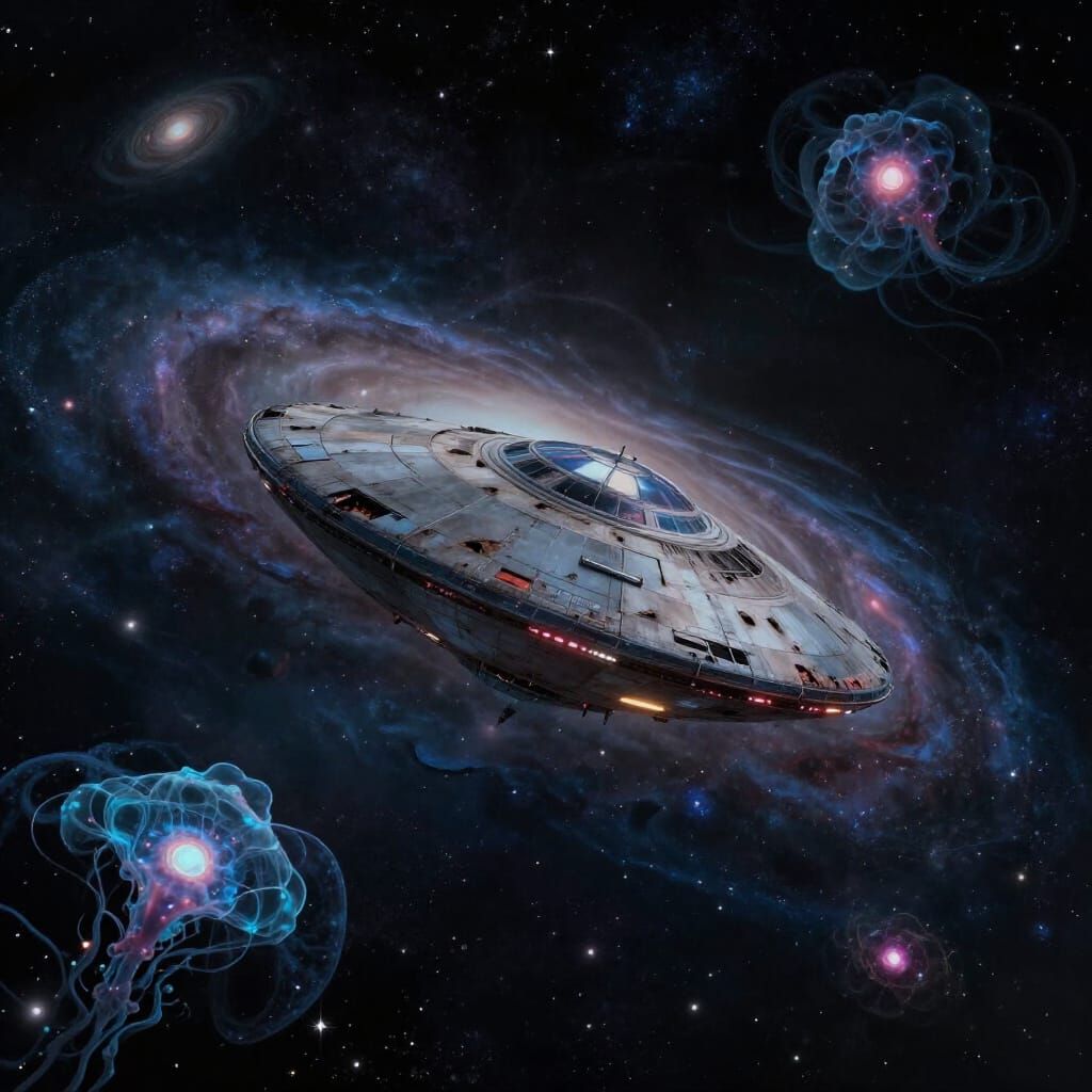 This image depicts a vast cosmic ocean with swirling galaxies and blooming nebulas. A lonely, abandoned UFO floats through the celestial expanse, rendered in a surrealist style with an inky color palette and glowing elements.