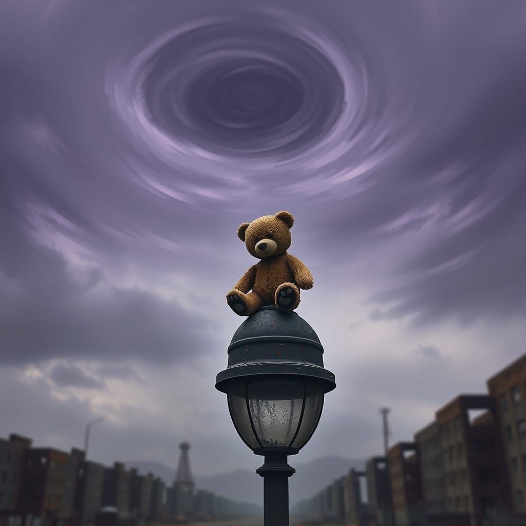 This airbrush art depicts a lone, worn teddy bear on a rusted streetlamp. A swirling vortex of purple and grey skies creates a dreamlike, melancholy atmosphere of lost childhood.