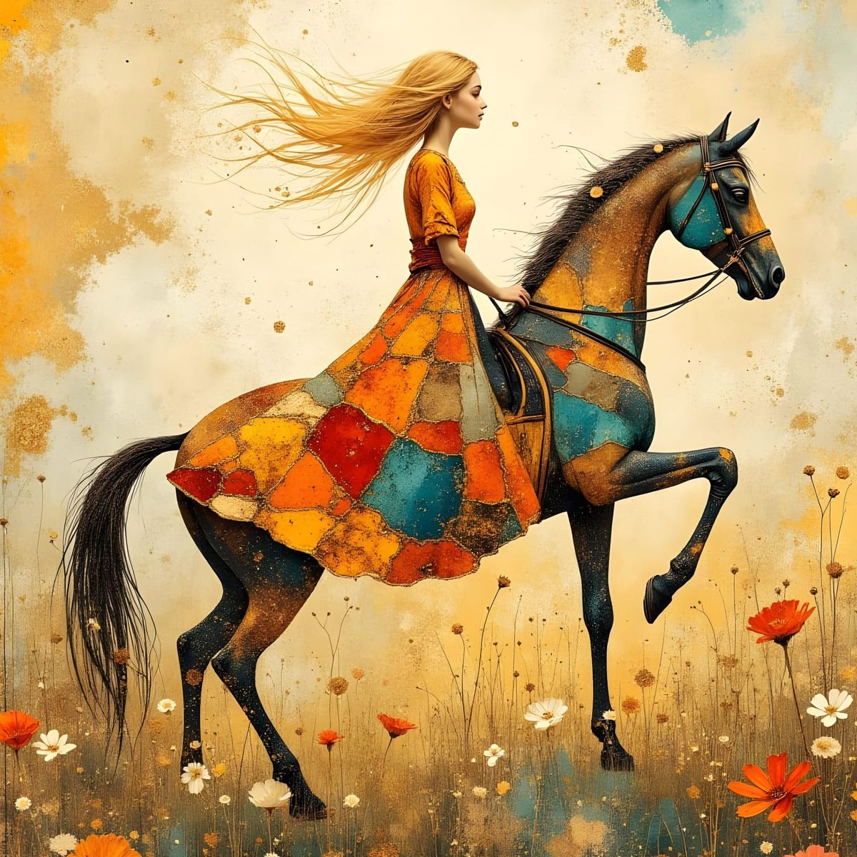 A vibrant folk art image of a long-legged woman in a patchwork dress, riding a horse jumping over a fence in a sunny meadow. Emphasizes a handcrafted, naive aesthetic.
