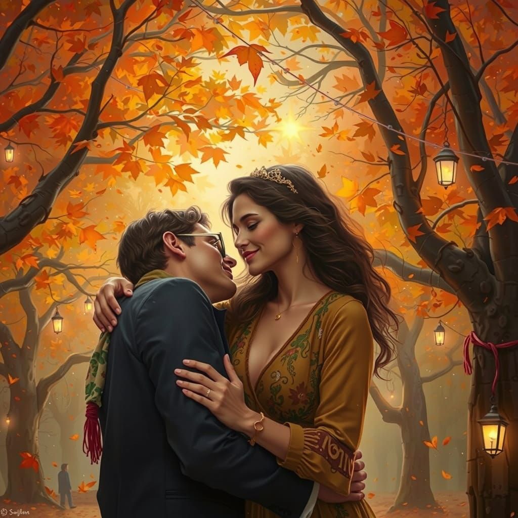 A vibrant image of a couple embracing beneath a starry autumn sky. The scene is filled with orange leaves and string lights, rendered with soft, warm colors in a fantasy art style.