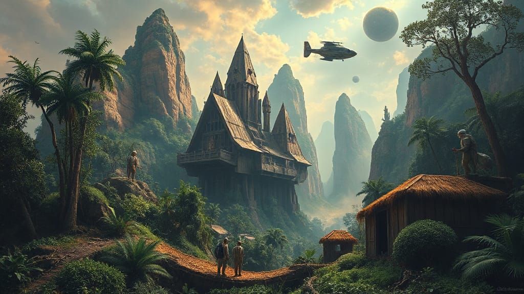 This image shows settlers exploring an alien jungle world. The scene is reminiscent of a high-quality movie, with intricate details, cinematic lighting and vibrant colours. It is rendered as surrealist oil painting.