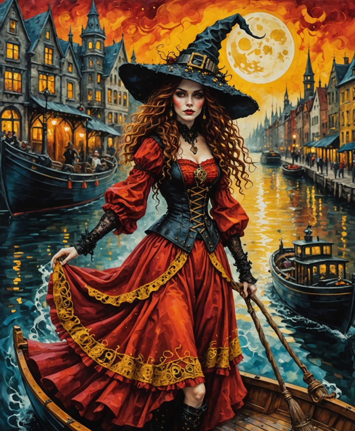 This intricate illustration depicts a steampunk witch in a red dress piloting a boat. The scene features a night city backdrop with vibrant street lighting, rendered in vivid colors with bold brushstrokes.