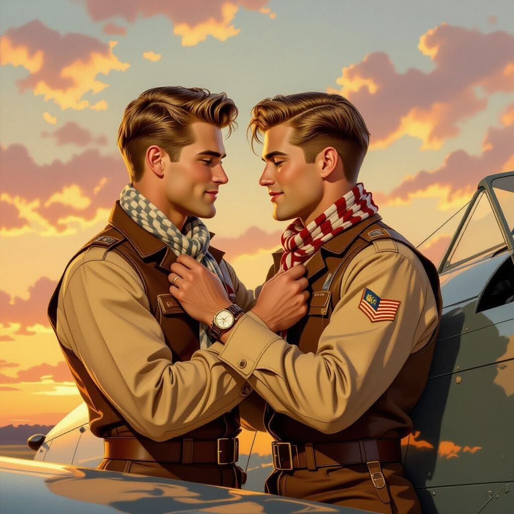 This illustration depicts two handsome men in vintage aviation uniforms sharing an affectionate moment on a biplane wing during a warm sunset. Rendered in an idealized, nostalgic style with rich colors.