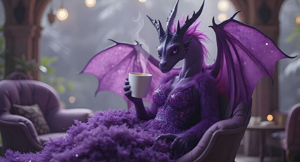This image shows a majestic purple dragon enjoying a coffee in a magical cafe. The dragon is adorned in a jeweled dress, with glowing runes and floating lanterns creating a fantasy atmosphere.