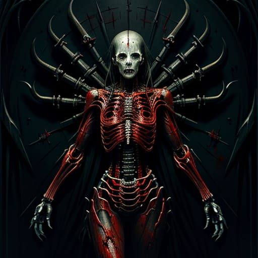 A detailed horror painting depicting the bloody autopsy of a cybernetic female. The artwork features intense body horror elements, rendered in a dramatic, illustrative style.