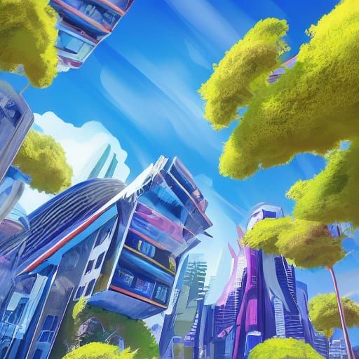This photorealistic digital painting showcases a clean, futuristic city with geometric shapes and smooth surfaces, set against a vibrant blue and green landscape under bright sunshine.