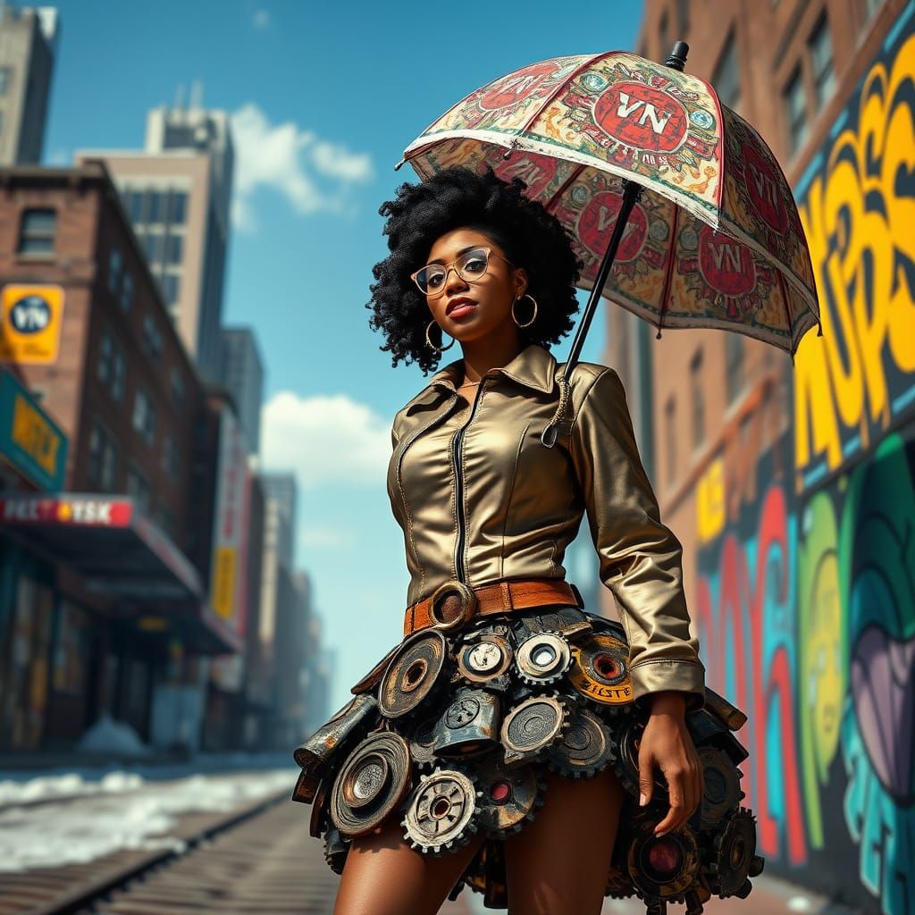 This image shows a vibrant Afro-Latina woman in a cyberpunk-inspired outfit, blending industrial and steampunk elements with bright colors and graffiti. She exudes confidence and playfulness, embodying the spirit of the city streets.