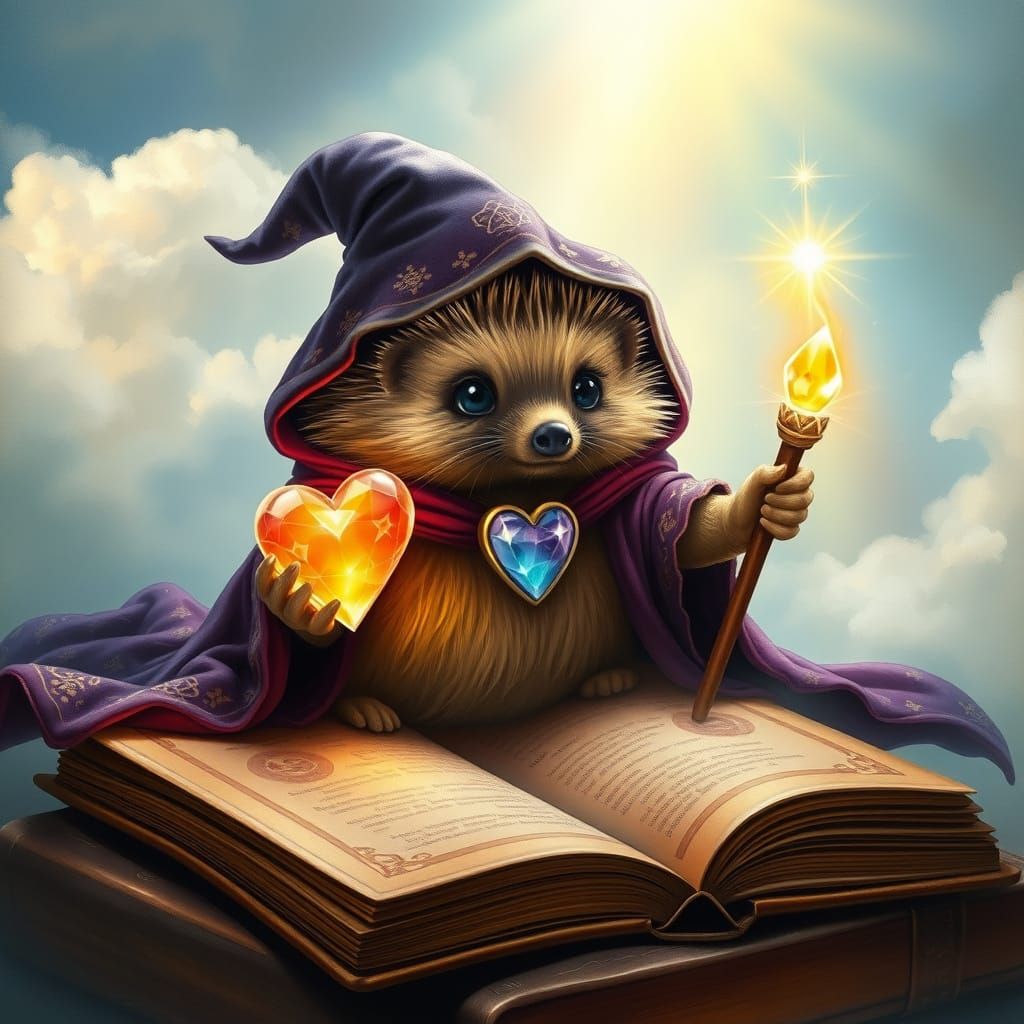 This enchanting image features a wizard hedgehog, dressed in a flowing velvet cape, holding a radiant light crystal heart and magic wand on an open book. Soft, luminous magic energy emanates from the hedgehog, infused with heavenly sunshine and divine clouds, evoking a dreamy, ethereal quality reminiscen...