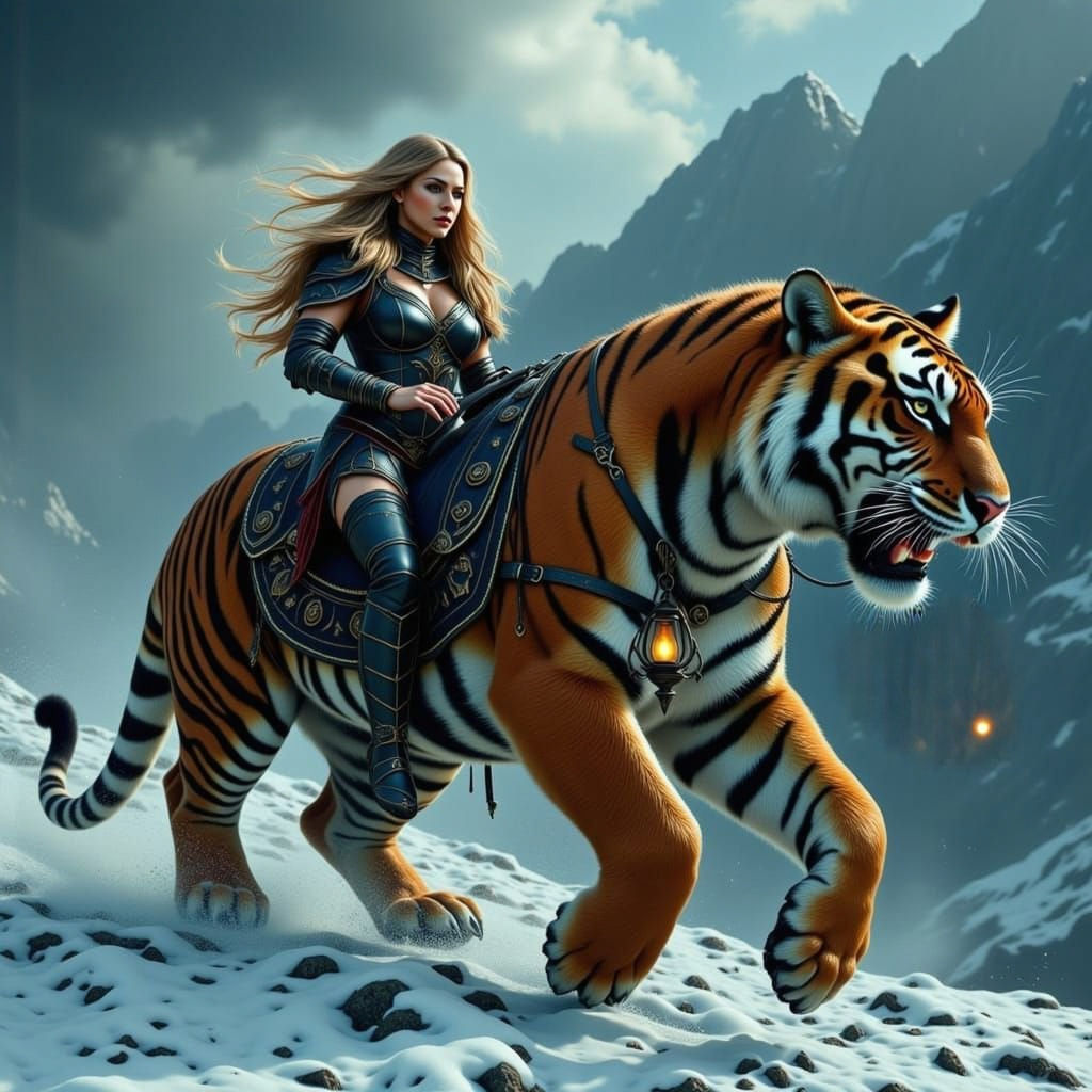 A fierce, ethereal Nordic warrior woman in ornate leather armor rides a colossal, muscular tiger through a snowy mountain pass under a stormy sky. Cinematic lighting enhances the dramatic scene.