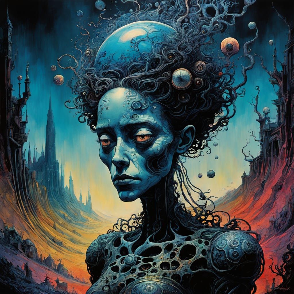 This image showcases a vibrant, dreamlike scene with bold, bleeding colors and delicate patterns, evoking the subconscious mind and the world of the unknown, in a style reminiscent of surrealists and fantasy artists