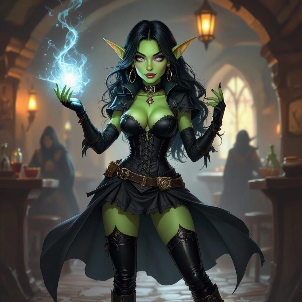 This image shows an attractive female goblin sorcerer in a dark fantasy concept art style. She casts a spell in a dimly lit tavern with dramatic lighting and shadows.