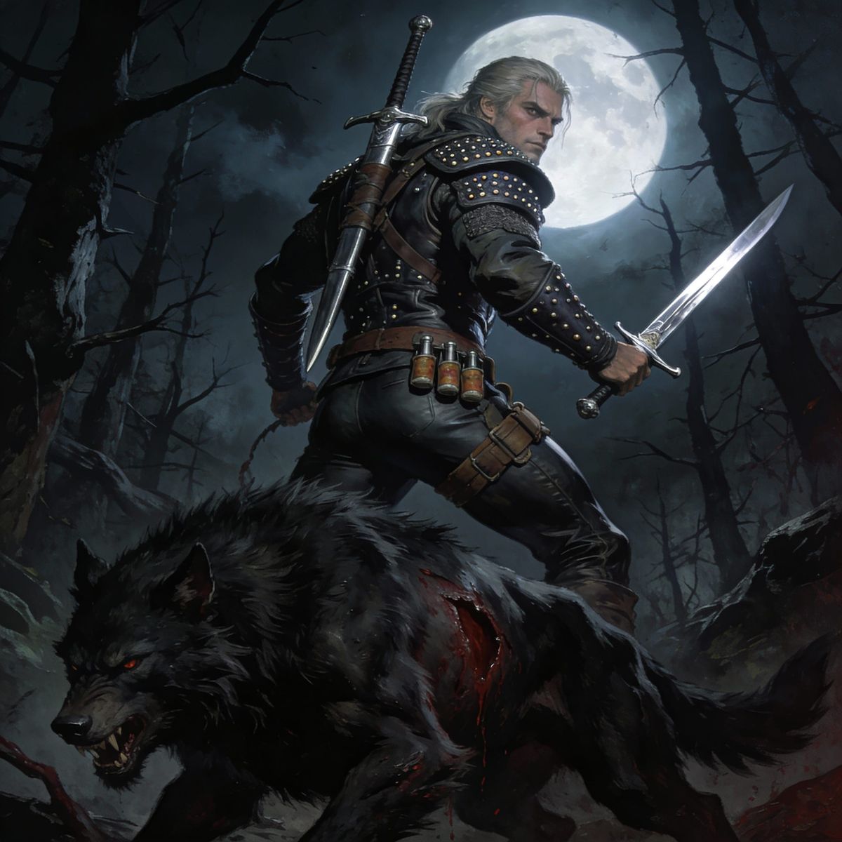 This illustration captures a Witcher pursuing a bleeding werewolf through terrifying, moonlit woods. The art style blends detailed, realistic fantasy illustration with a dark, sensual atmosphere.