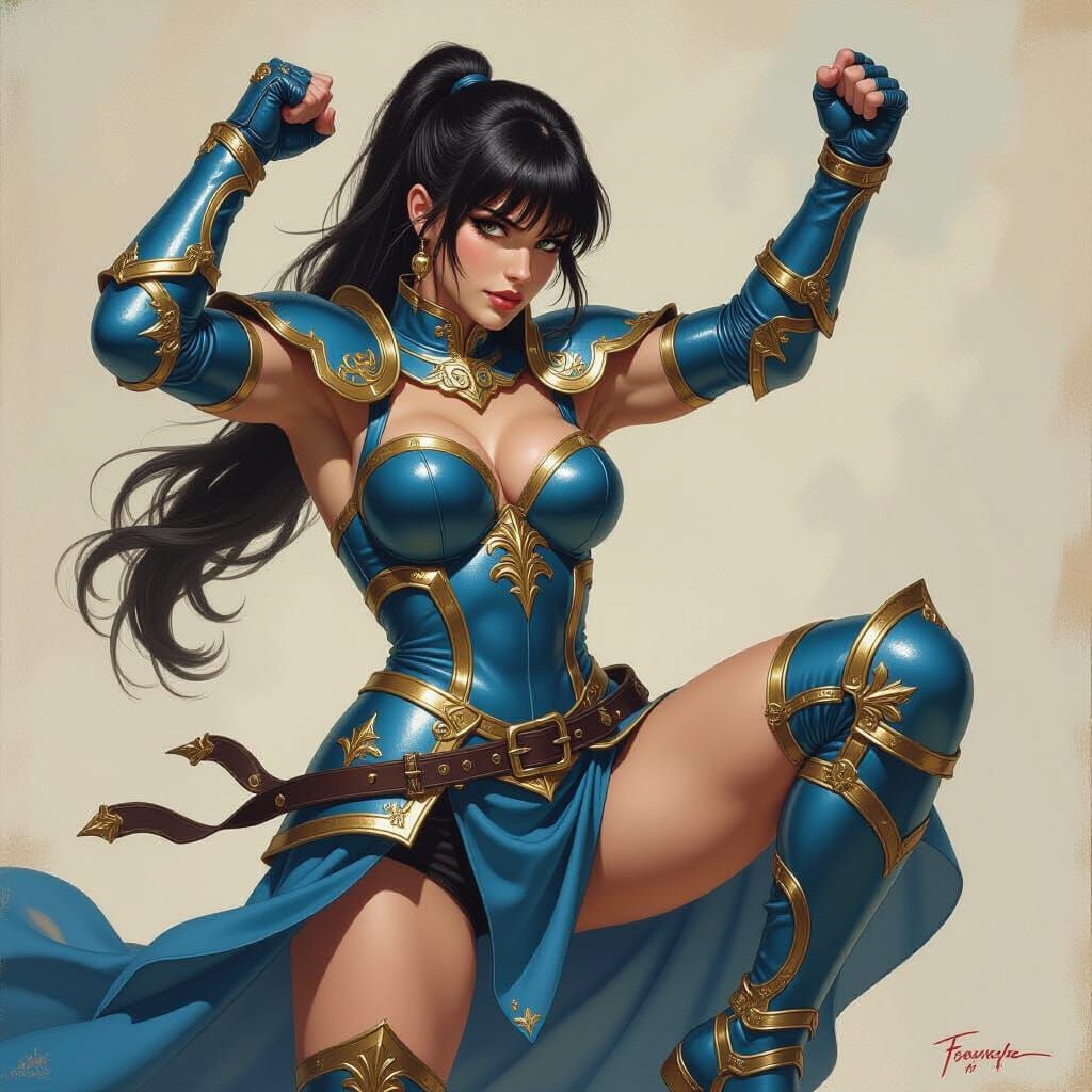 A vibrant oil painting of a young female knight with black hair and heterochromia, clad in blue and gold armor. The artwork captures a dynamic, heroic pose with intricate details.