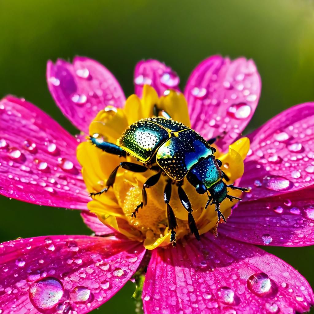 A macro photograph of a glistening metallic beetle on a pink flower. The image captures water droplets illuminated by the morning sun, highlighting the intricate details of the scene.