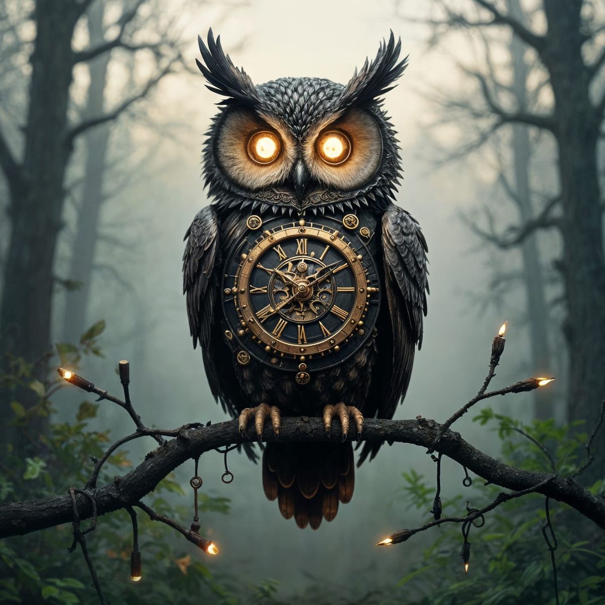A majestic, clockwork owl perches on a branch made of intertwined wires and circuits, overlooking a serene, misty forest clearing.