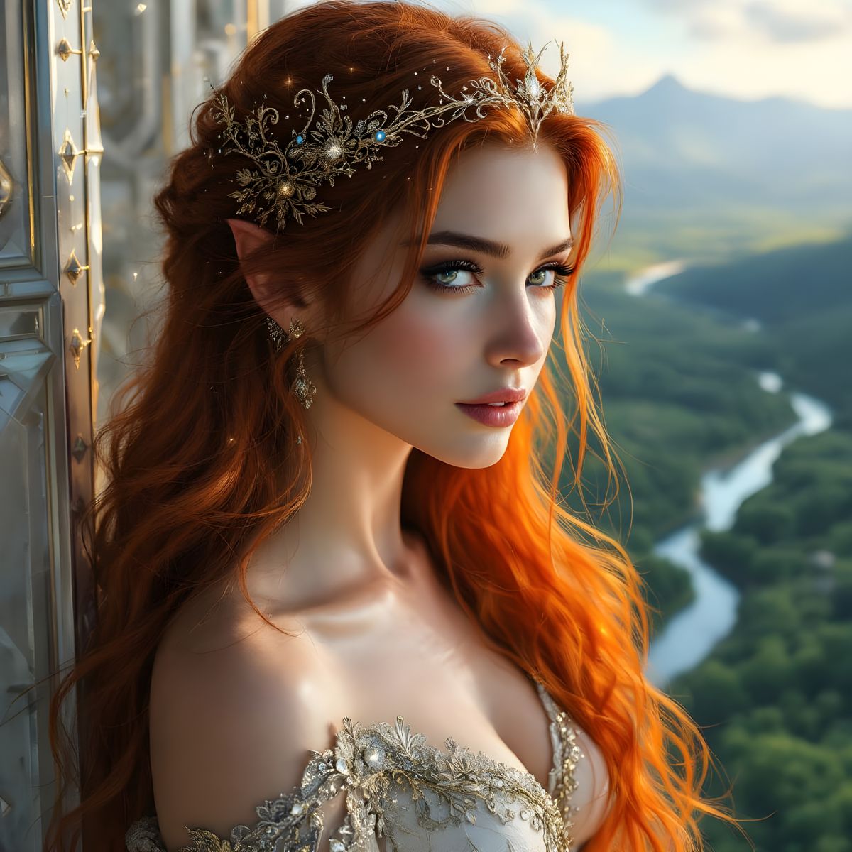 A stunning image of an elven queen overlooking her realm. The image features dramatic lighting and a rich color palette, reminiscent of art nouveau with hyperreal rendering.