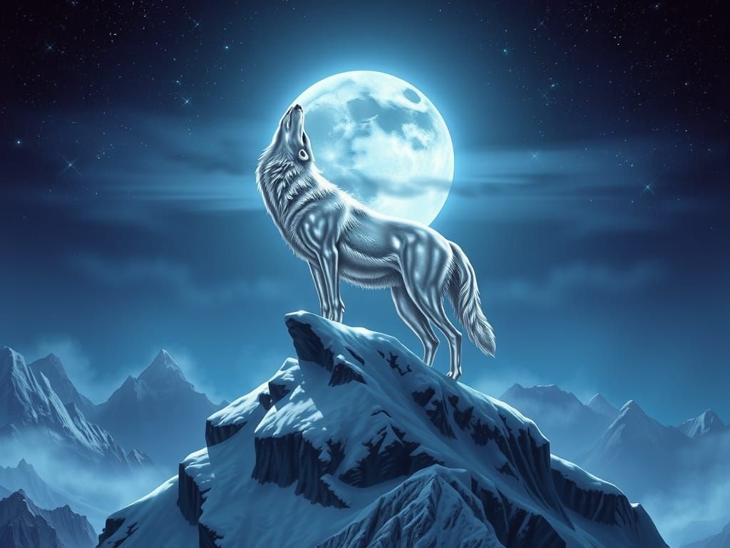 A stunning image of a silver wolf silhouetted against a starry, moonlit sky atop a snowy mountain. Volumetric lighting and mist enhance the ethereal fantasy of this dramatic scene.